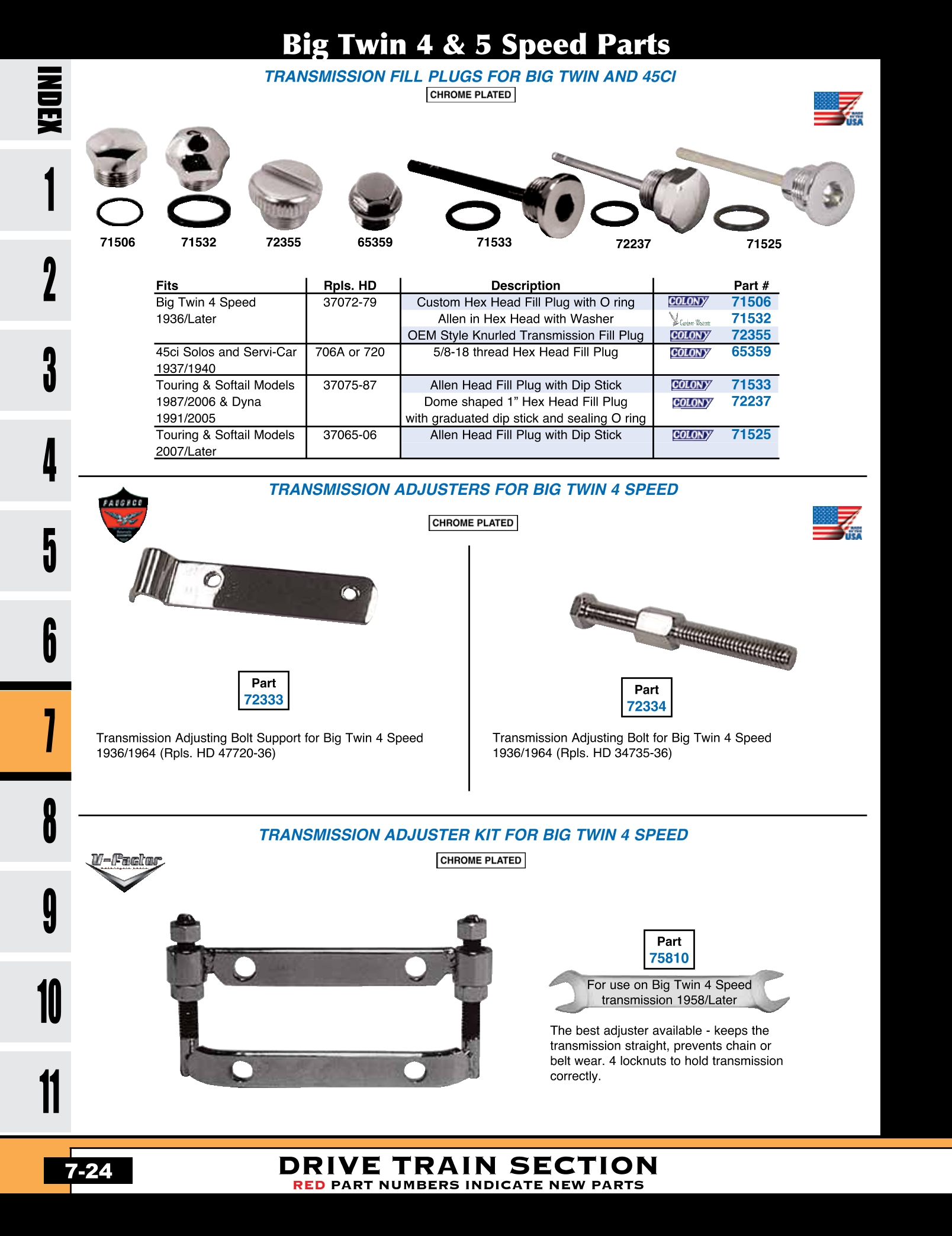 | MU-71506 | TRN FILL PLUG,HEX HEAD CHROME BIG TWIN 4 SPD 1936/LATER RPLS HD 37072-79 COLONY 7351-2 | EACH | 13.88 |