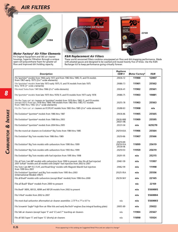 | 15924 | K&N AIR FILTER S&S SHORTY CARB | 41.99 | 35.49 |