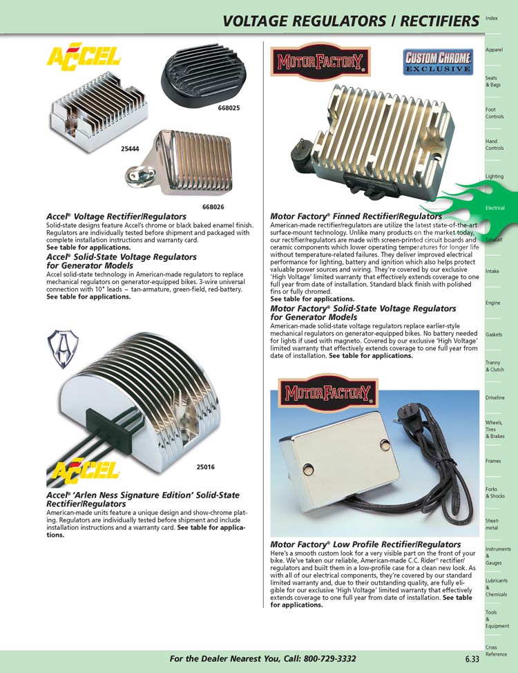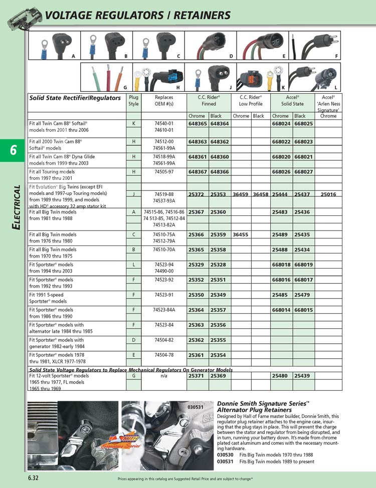 Here's a smooth custom look for a very visible part on the front of your bike. We've taken our reliable, American-made C.C. Rider rectifier/regulators and built them in a low-profile case for a clean new look. As with all of our electrical components, they're covered by our standard limited warranty and, due to their outstanding quality, are fully eligible for our exclusive 'High Voltage' limited warranty that effectively extends coverage to one full year from date of installation. See table for applications.