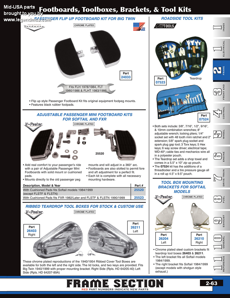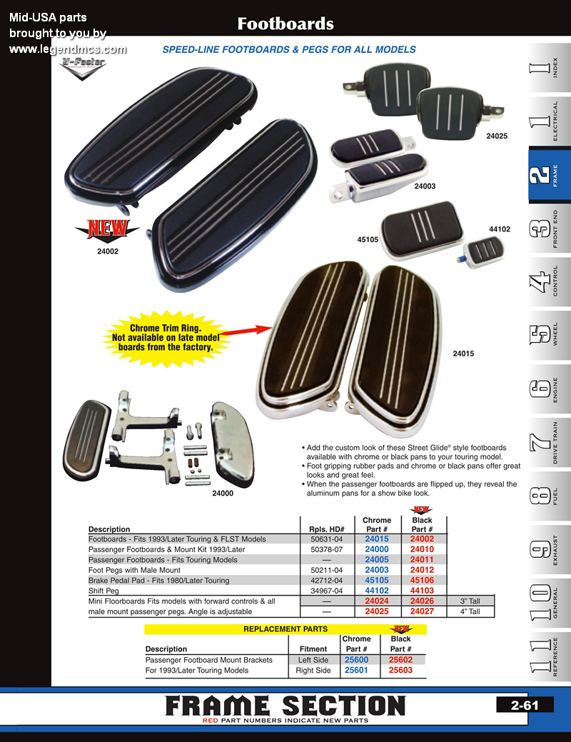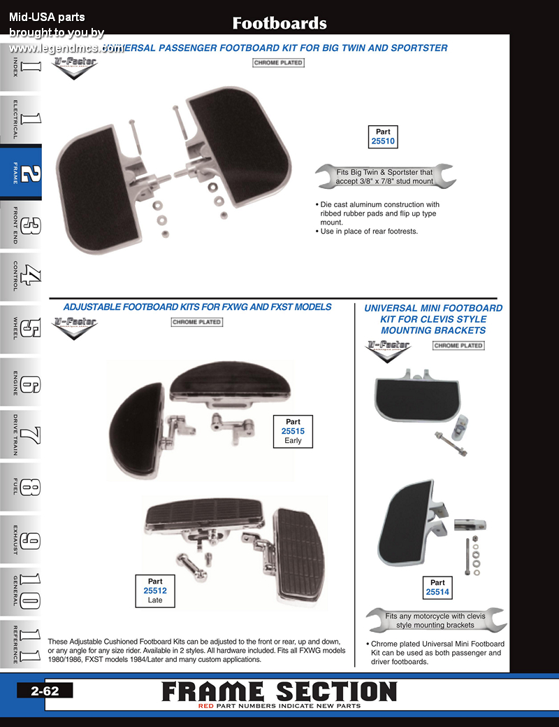 | MU-25523 | FOOTBOARDS,MINI PASSENGER ADJ FLSTF,FLSTN 90/99 FXR 82/L CUSHIONED MT TO PASS PEG MT | 149.35 | 132.63 |