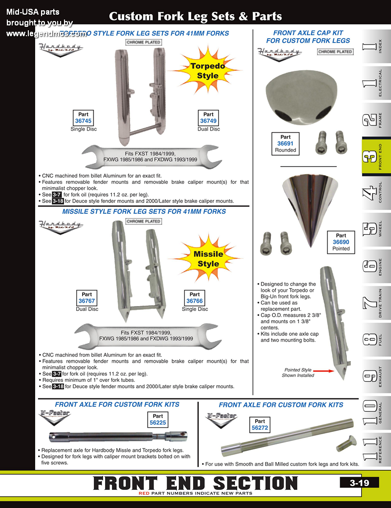 | MU-36767 | FR FORK LW LEGS,MISSILE STYLE FXST 84/99,FXWG 85/86,FXDWG 93 /99,DUAL DISC 41MM,CHROME | 499.98 | 434.77 |