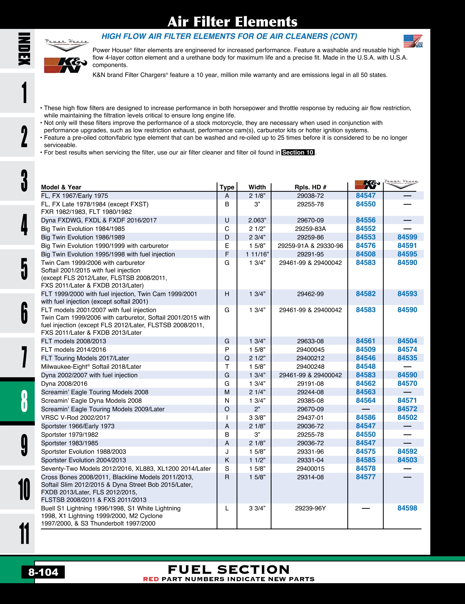 | MU-84582 | AIR FILTER ELEMENT,K&N HD-8899 FLT MODELS W/EFI 1999/2000 1-3/4" WIDE RPLS HD 29462-99 | EACH | 80.50 |