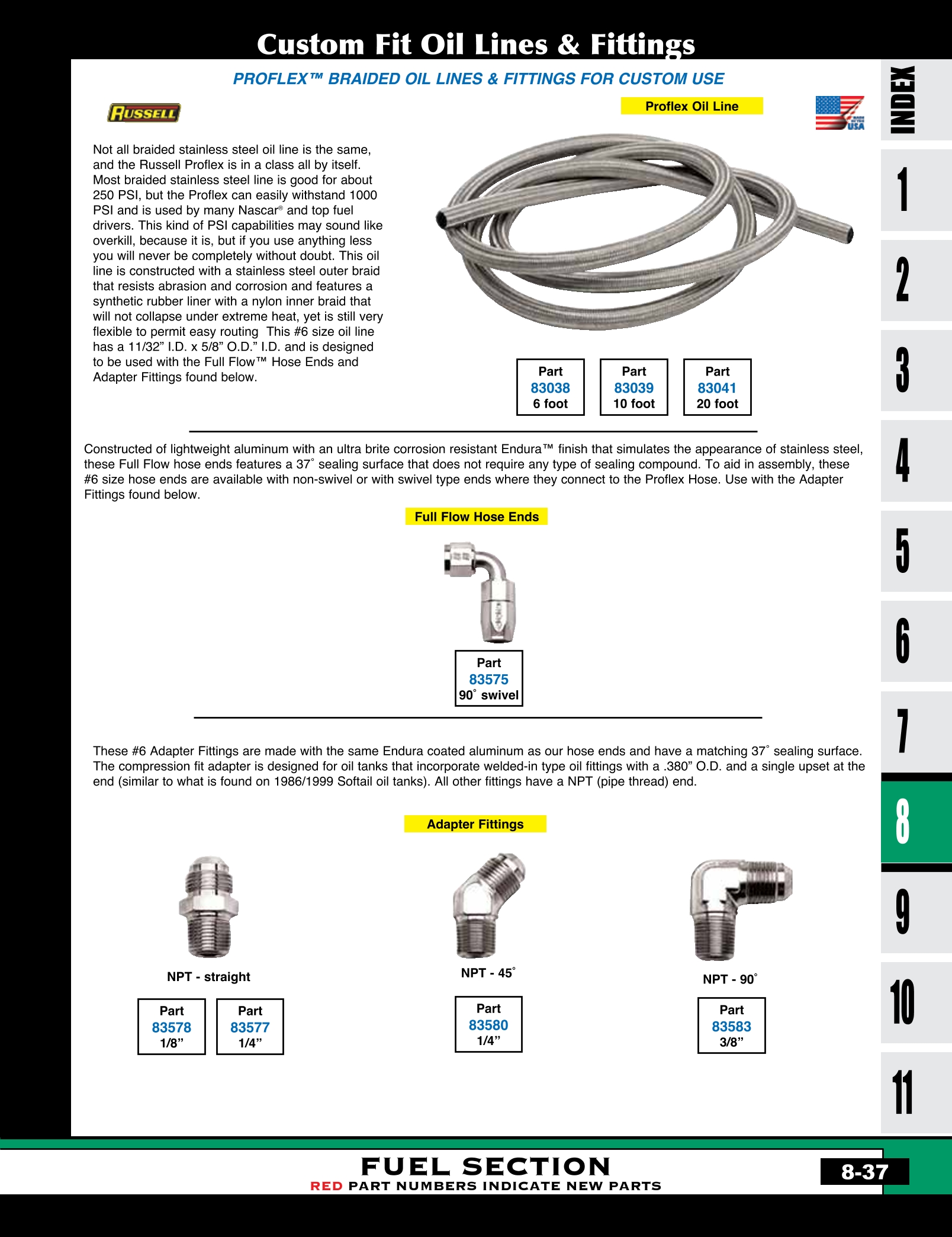 | MU-83039 | OIL LINE,SS BRAIDED PROFLEX 10'X 11/32"I.D. USE WITH FULL FLOW #6 HOSE ENDS ..... R3207 | EACH | 105.50 |