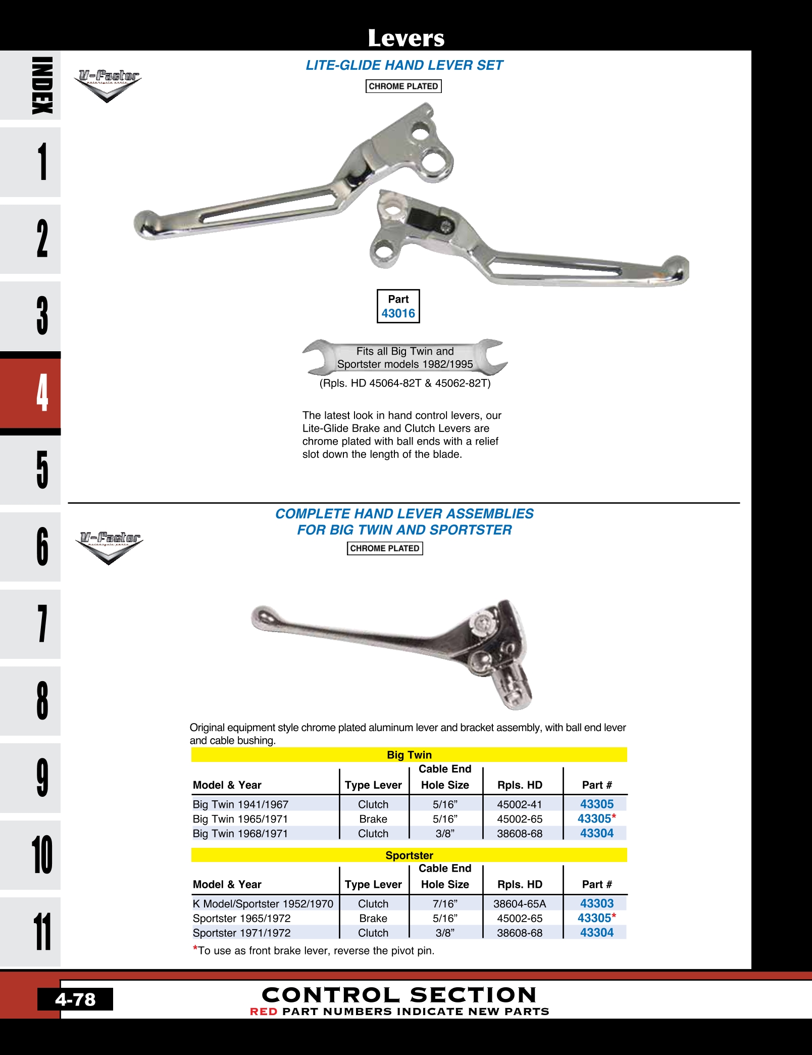 | MU-43007 | HAND LEVER,CLUTCH & DRUM BRAKE ALL MODELS 1936/81 STOCK STYLE CHROMED RPLS HD 45080-83T | EACH | 9.75 |