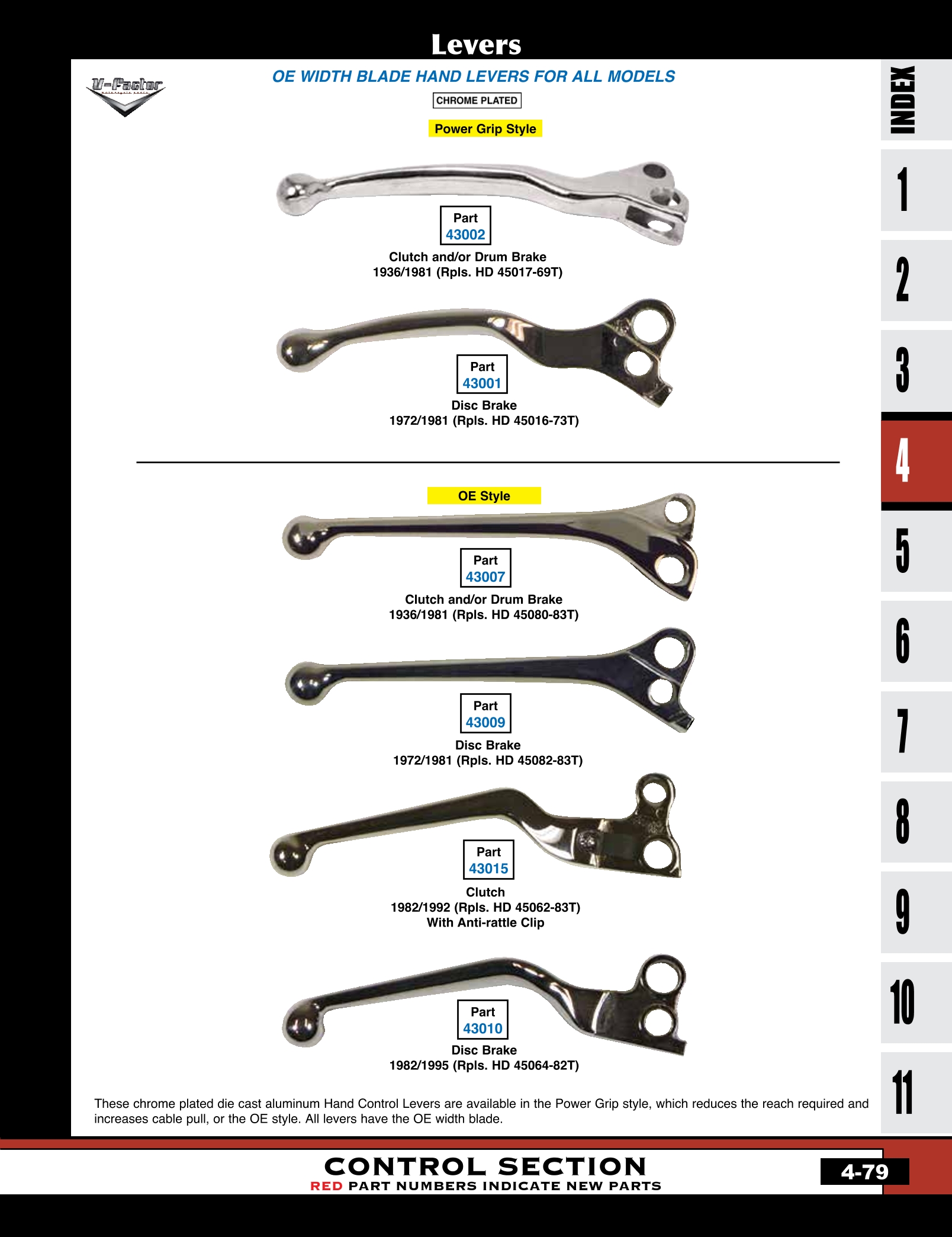 | MU-43010 | HAND LEVER,BRAKE STOCK STYLE ALL MODELS 1982/1995 OEM STYLE CHROMED RPLS HD 45064-82T | EACH | 8.95 |