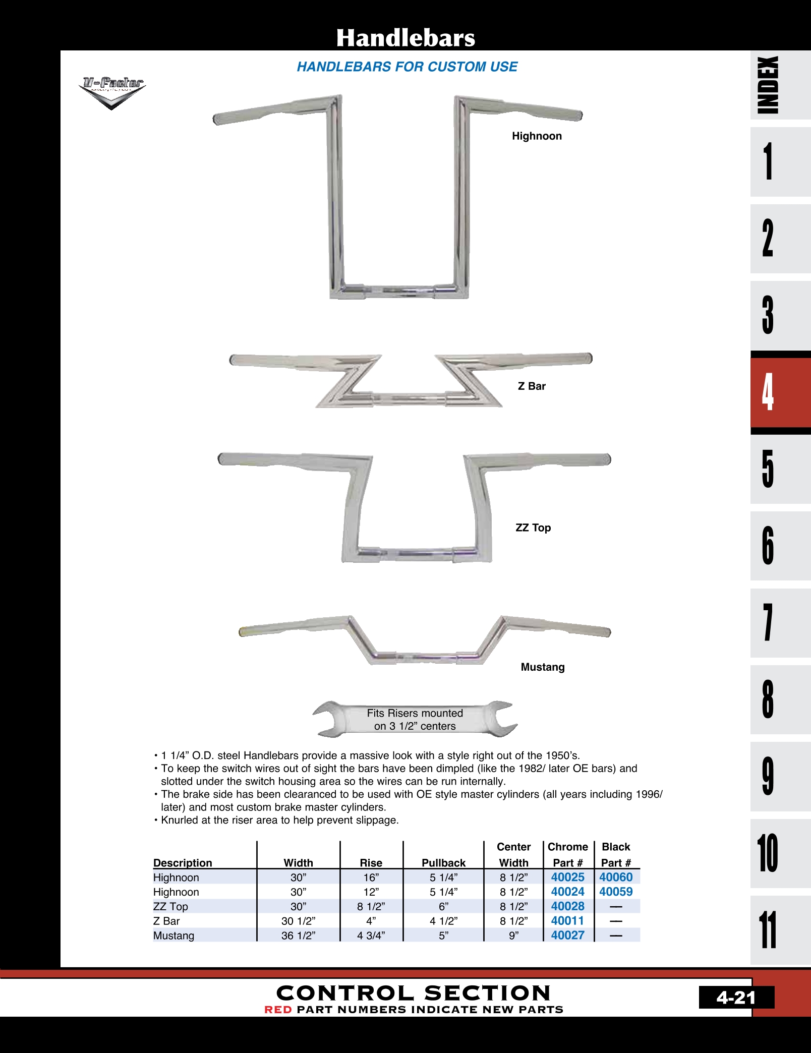 | MU-40011 | HANDLEBAR,CUSTOM Z STYLE,CP 30.5"WIDE,4"RISE,4.5"PULLBACK 1.25"OD,KNURLED RISER MOUNTS | EACH | 192.40 |