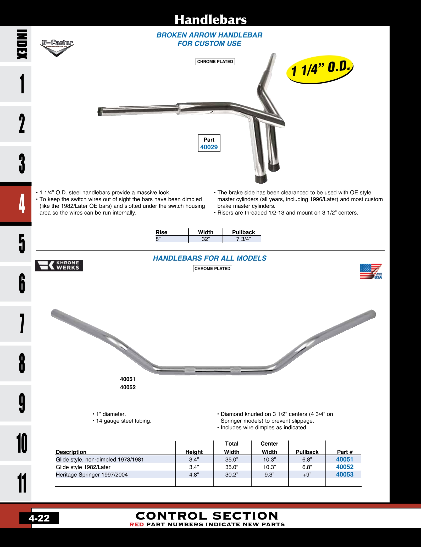| MU-40029 | HANDLEBAR,BROKEN ARROW,CHROME 32"WIDE,8"RISE,7.75"PULLBACK 1.25"OD,DRILLED & DIMPLED | EACH | 116.75 |