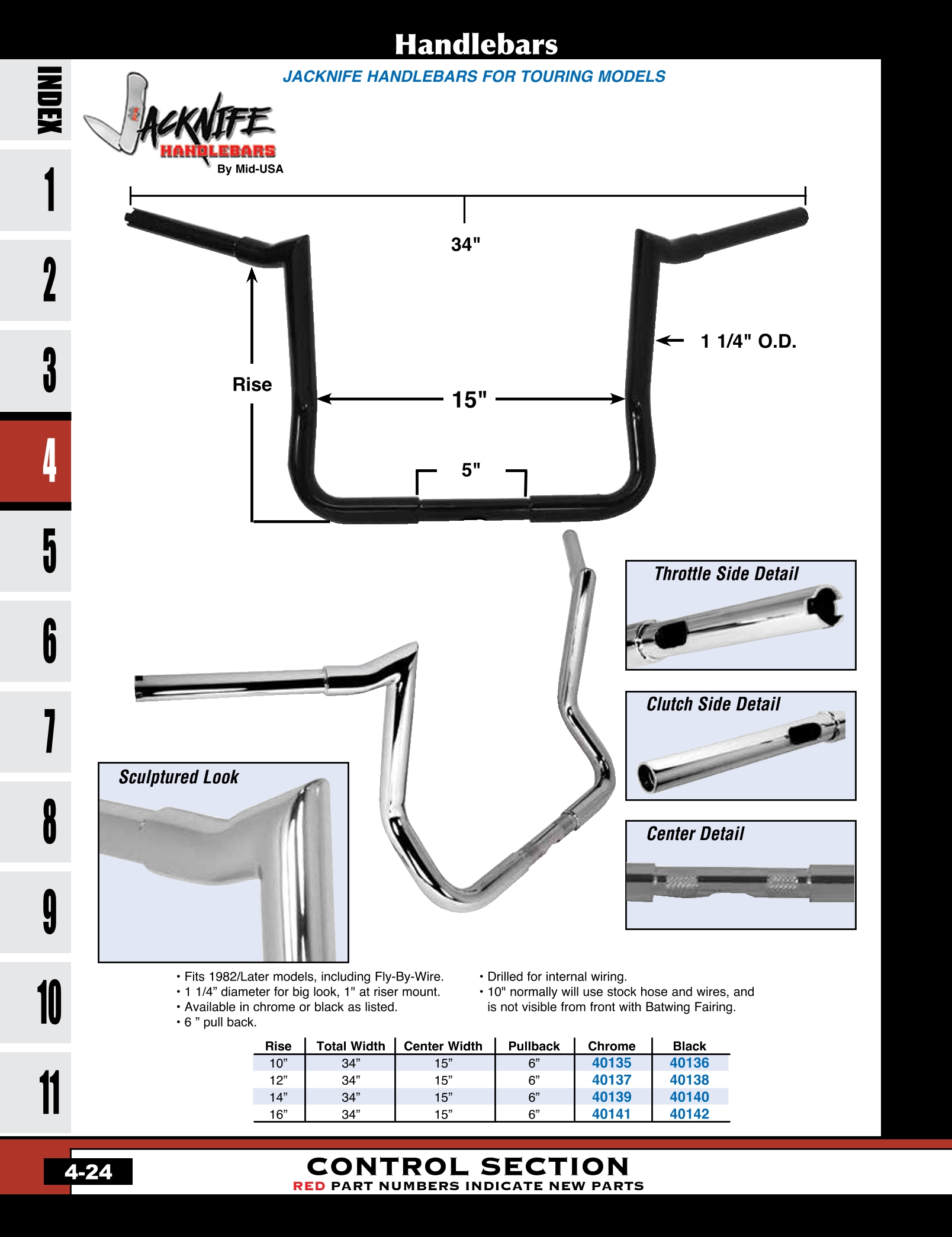 | MU-40135 | HANDLEBAR JACKNIFE 10" CP FITS TOURING MODELS 1.25" DIA FLY BY WIRE CHROME | EACH | 191.90 |