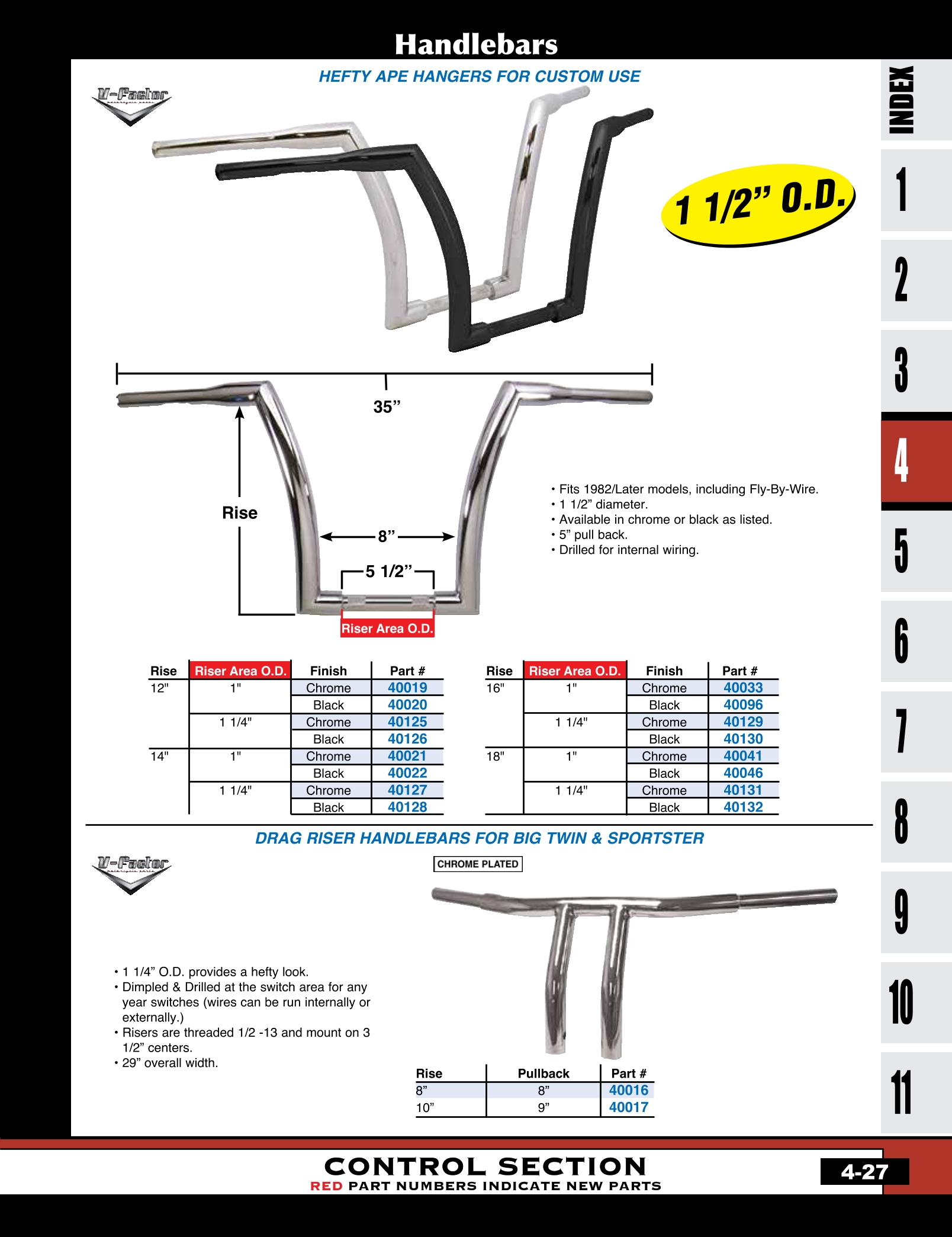 | MU-40000 | APE HANGER HANDLEBAR,12" RISE 82/L*,35" WIDE,8" CENTER WIDTH 8-5/8" PULLBACK W/CRIMP CP | EACH | 56.00 |