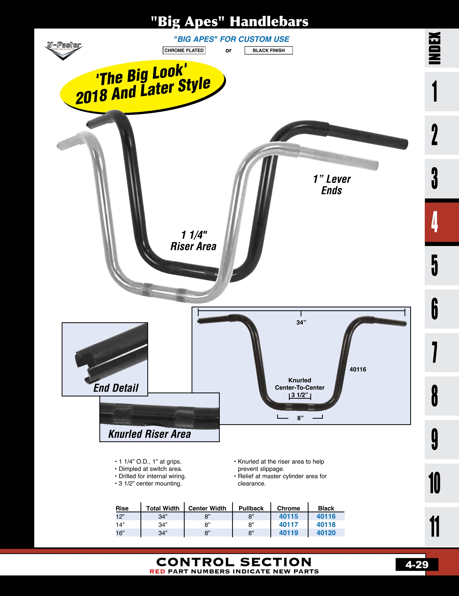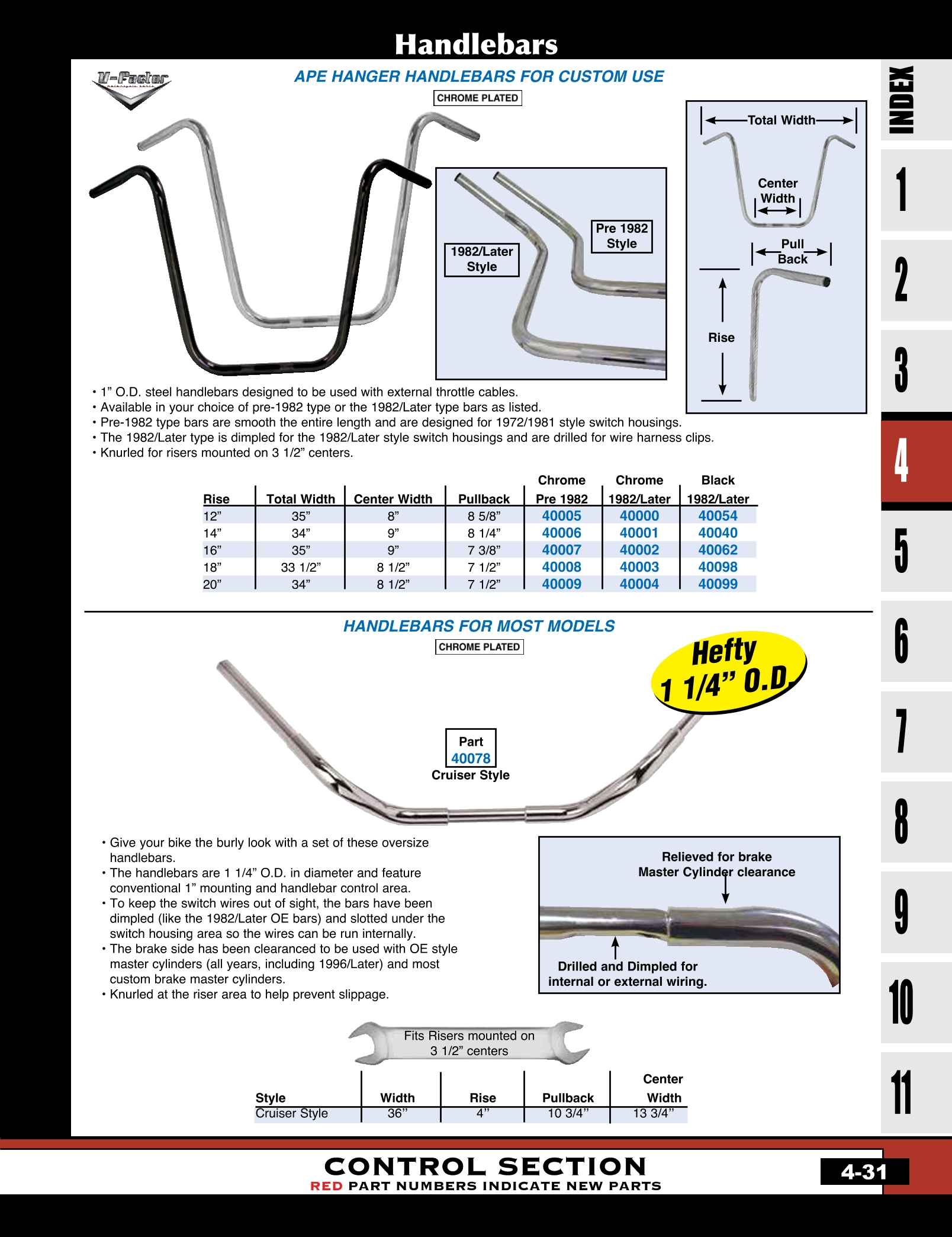 | MU-40006 | APE HANGER HANDLEBAR,14" RISE PRE 82,34" W,9" CENTER WIDTH 8-1/4" PULLBACK,CHROME PLATED | EACH | 62.20 |