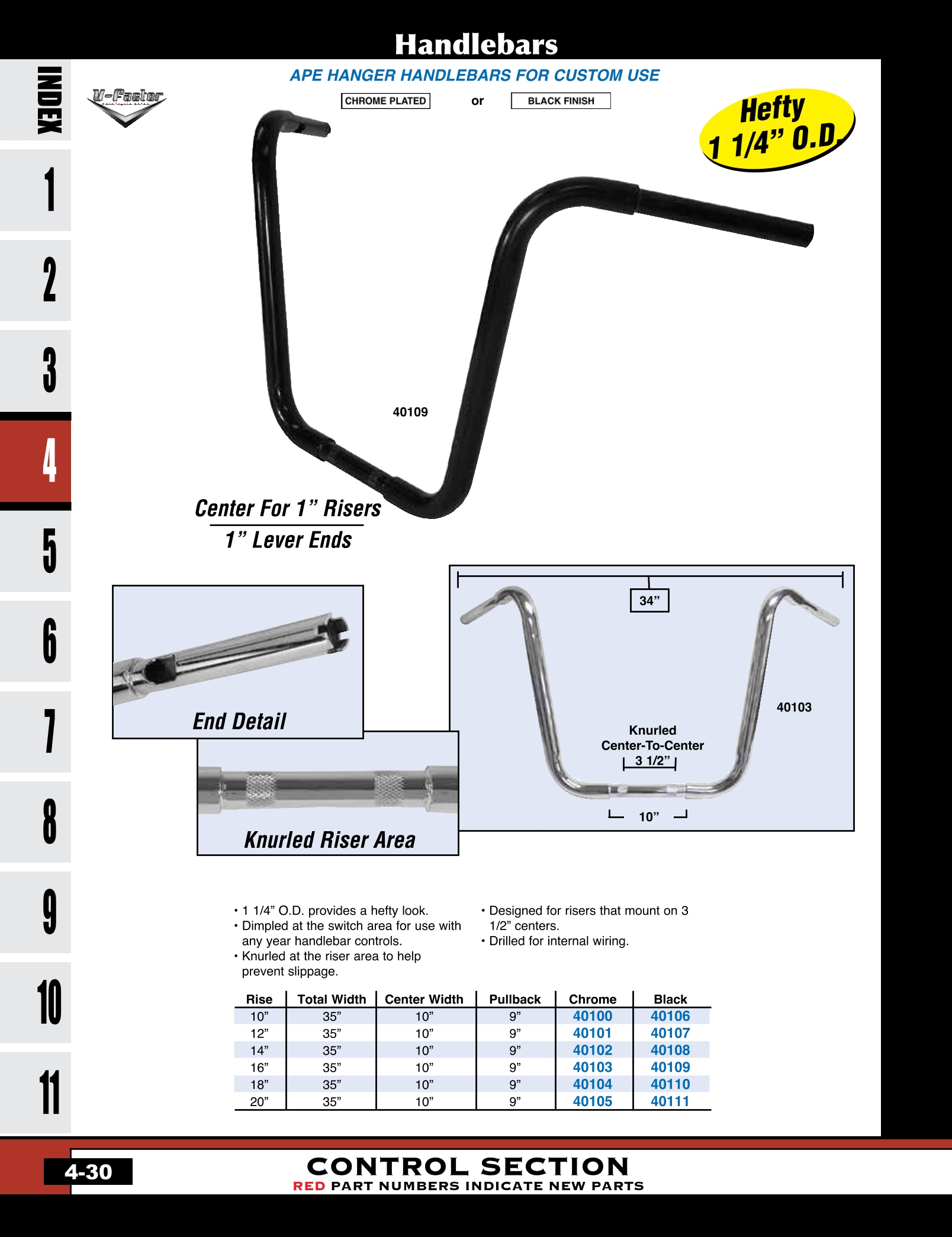 | MU-40106 | HANDLEBAR,HEFTY 10" APES 1-1/4 OD 9"PULLBACK, 9"CENTER WIDTH 35"OVERALL WIDTH, BLACK | EACH | 99.80 |