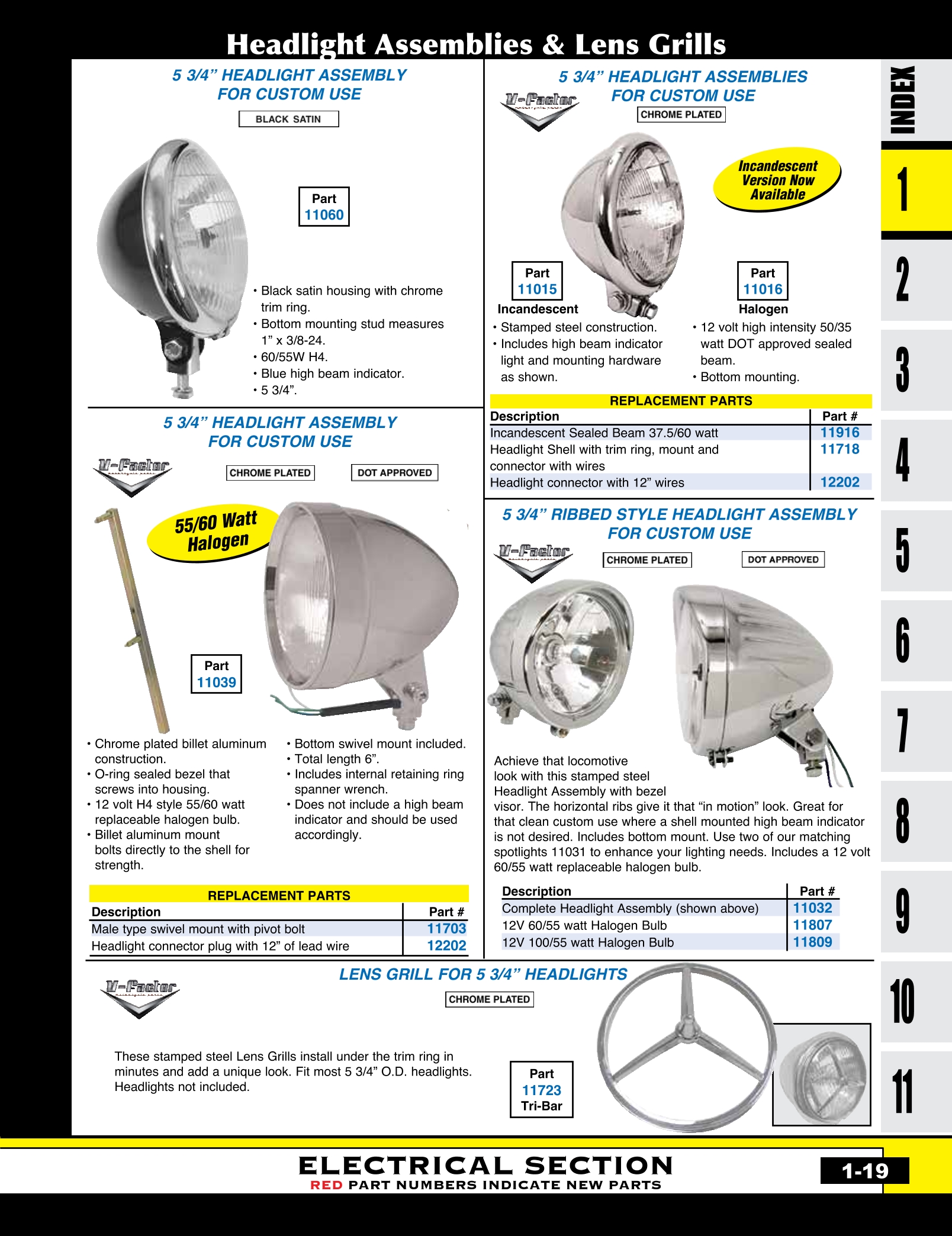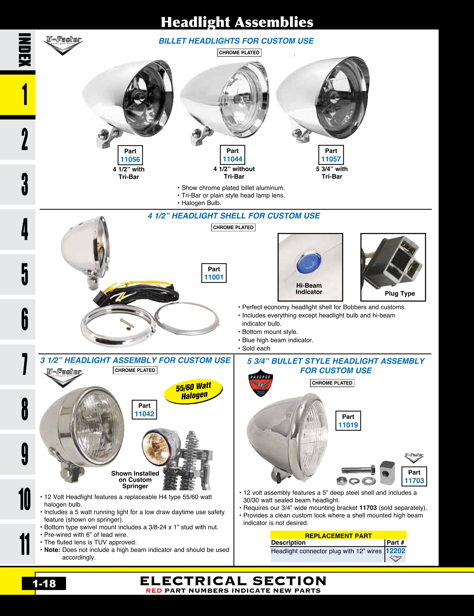 | MU-11056 | 4 1/2"CUSTOM HEADLIGHT ASY,12V TRI-BAR LENS,BILLET ALUMINUM HALOGEN BULB,CHROME PLATED | ASY | $ 142.00 |