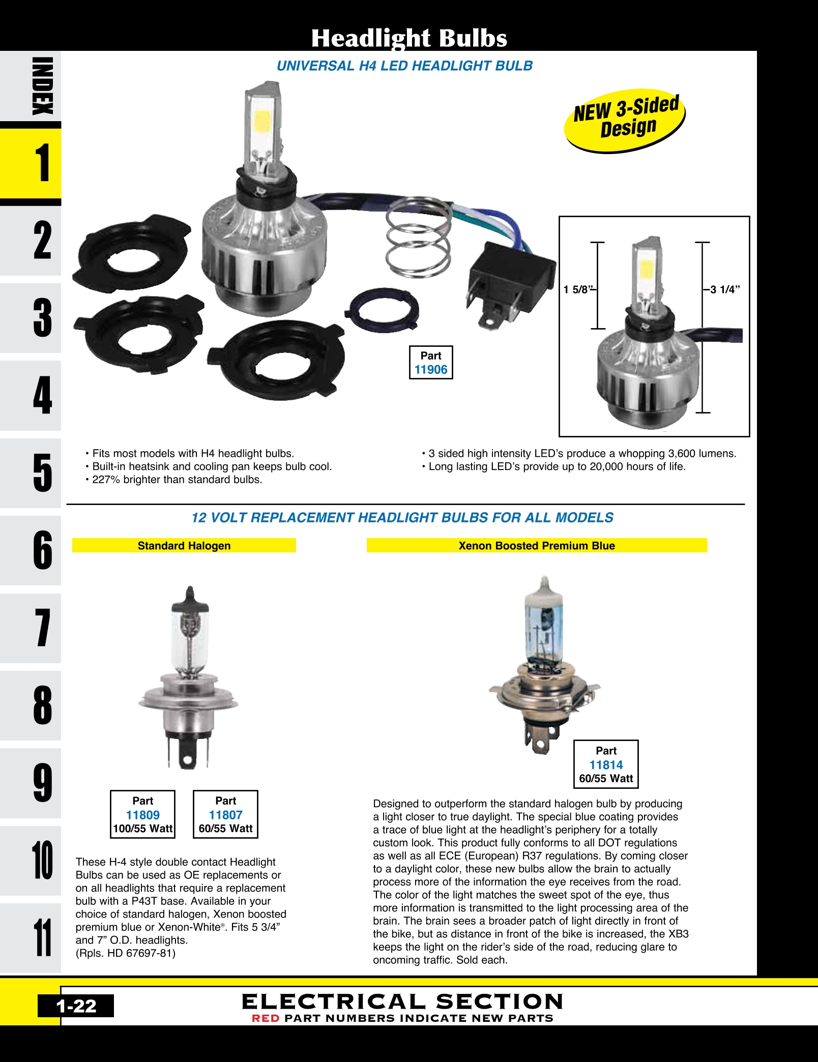| MU-11906 | HEADLIGHT 3 SIDED LED BULB ALL MODELS W/4H HEADLIGHT BULB 35W HI/ 18W LO | EACH | $ 29.95 |