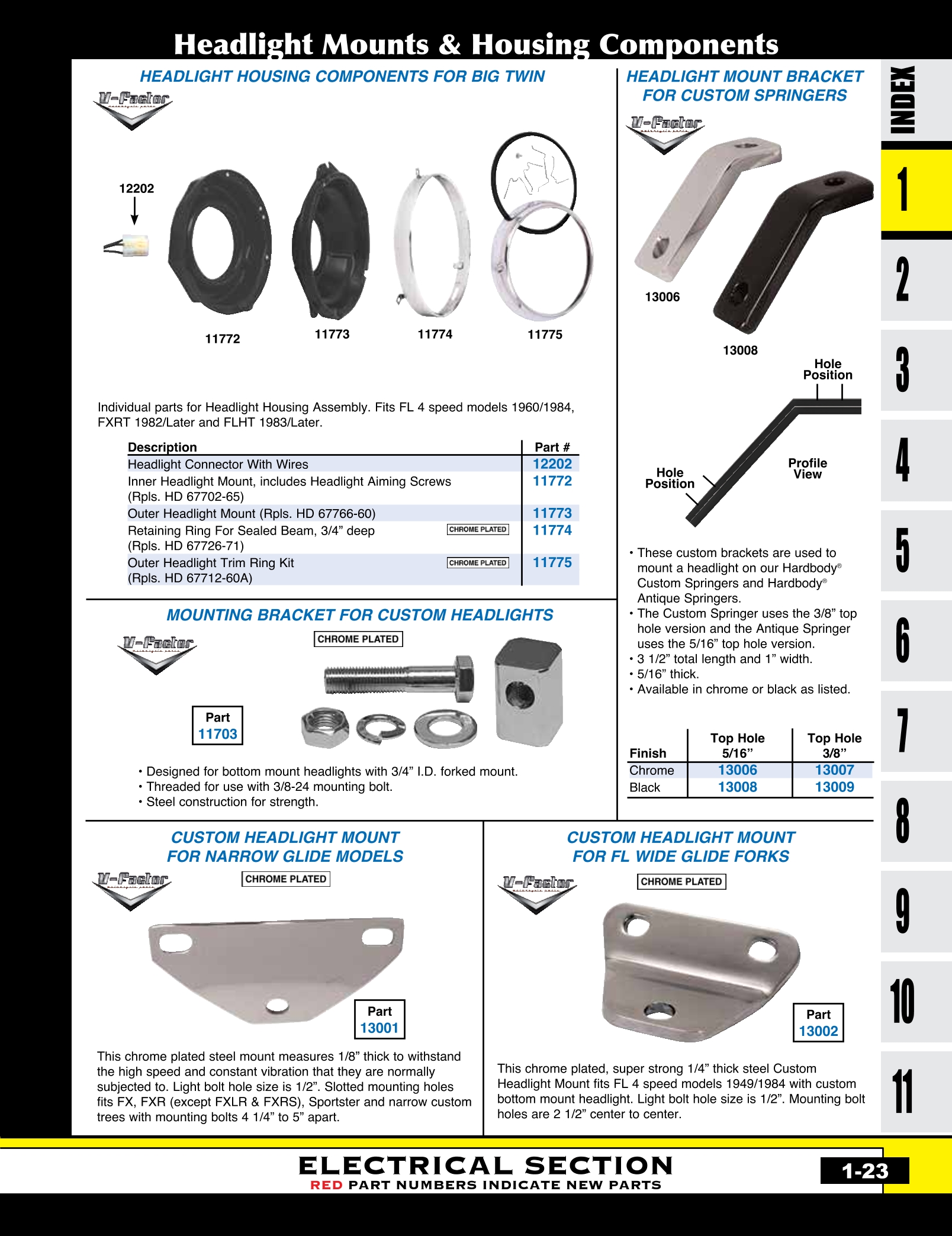 | MU-13002 | HEADLIGHT MOUNT,CUSTOM CHROMED FL 4 SPD 49/84 W/CUSTOM BOTTOM MOUNT LIGHT..HOLES 2-1/2" OC | EACH | $ 14.35 |