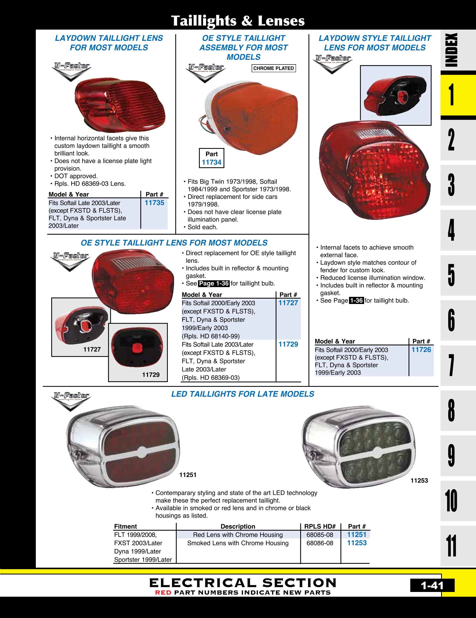 | MU-11251 | LED TAILLIGHT ASSEMBLY,RED SET 99/L*,DYNA 99/L*,FXST 03/L FLST 00/L*,FLT 99/08,RED LENS | EACH | $ 79.95 |
