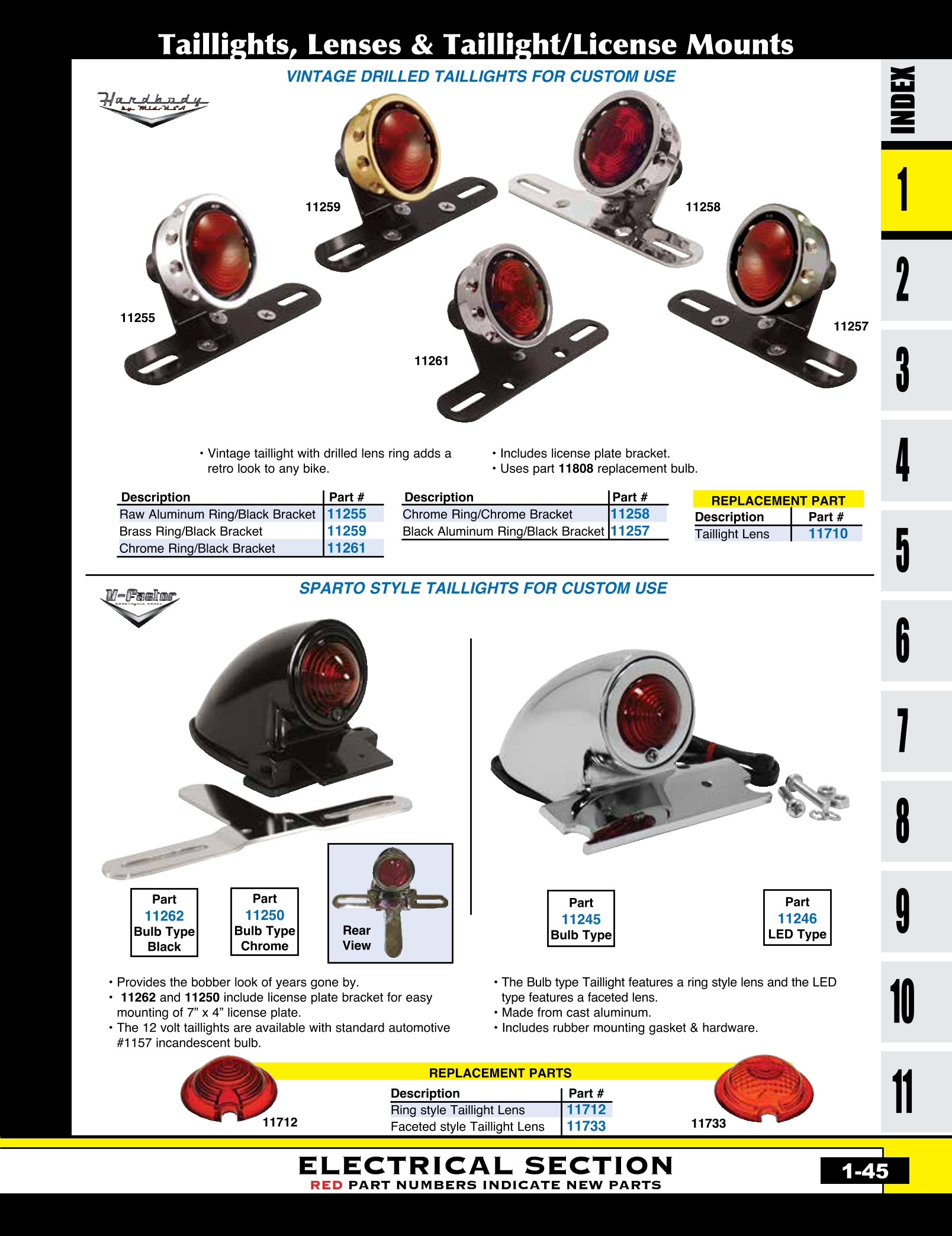 | MU-11261 | VINTAGE DRILLED TAILLIGHT CUSTOM USE, WITH 12 VOLT BULB CHROME RING, BLACK BRACKET | EACH | $ 46.40 |