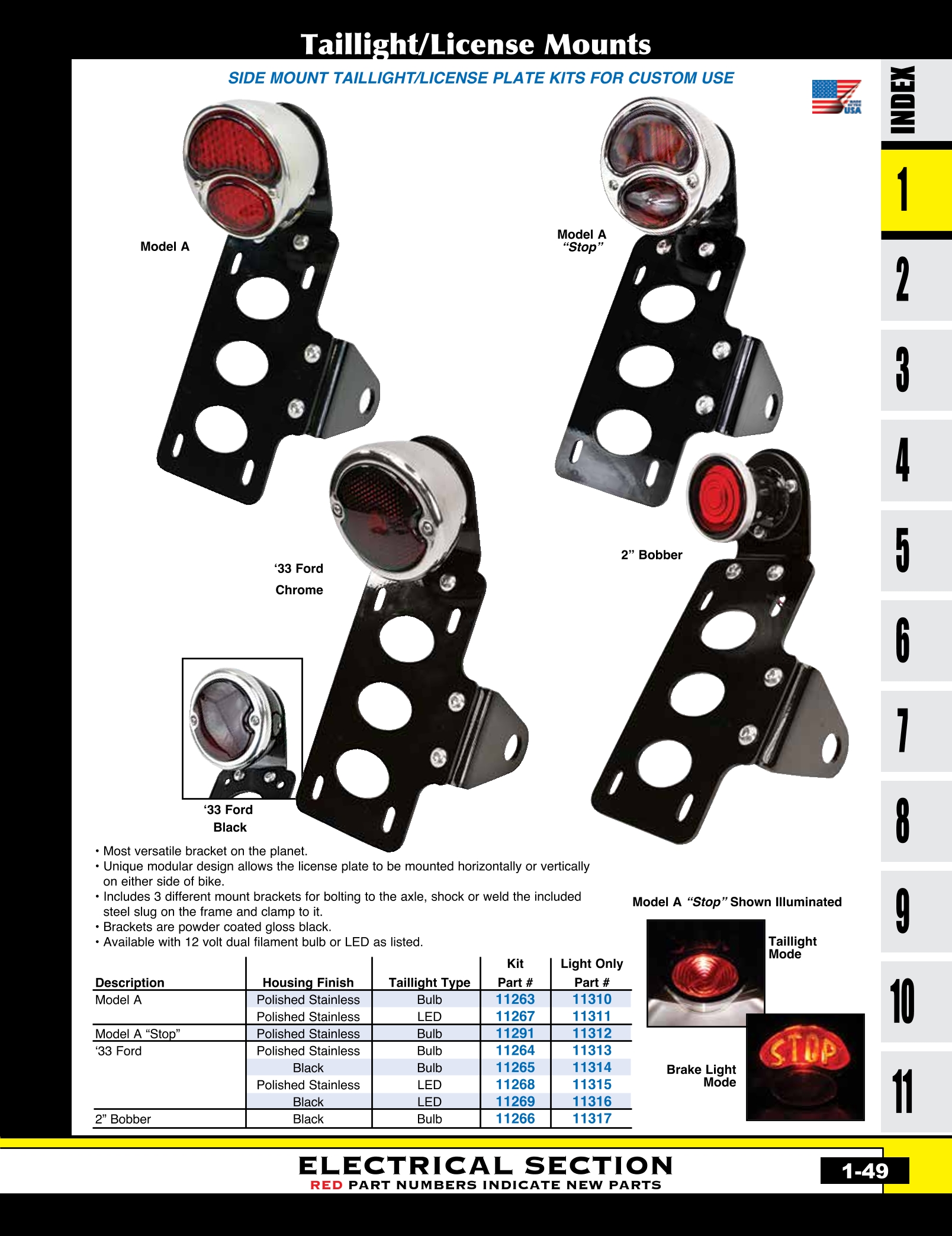 | MU-11263 | TAILLIGHT/LICENSE PL BRKT KIT CUSTOM USE,MODEL A LIGHT MOUNT HORIZONTAL OR VERTICAL | KIT | $ 99.99 |