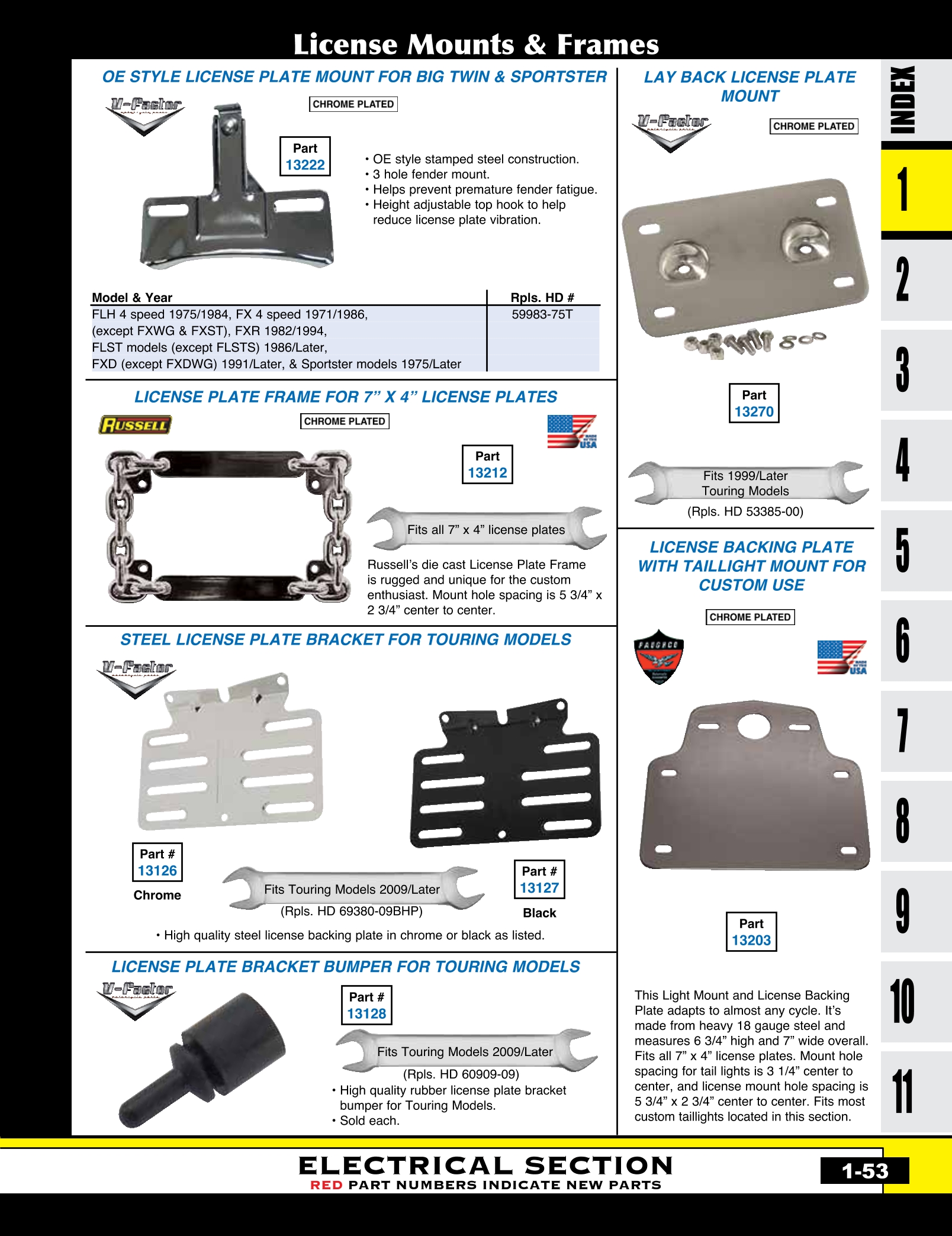 | MU-13222 | LICENSE MOUNT 3 HOLE OE STYLE MOST MODELS W/O FAT BOB FENDER REPLACES HD 59983-75T | EACH | $ 27.45 |