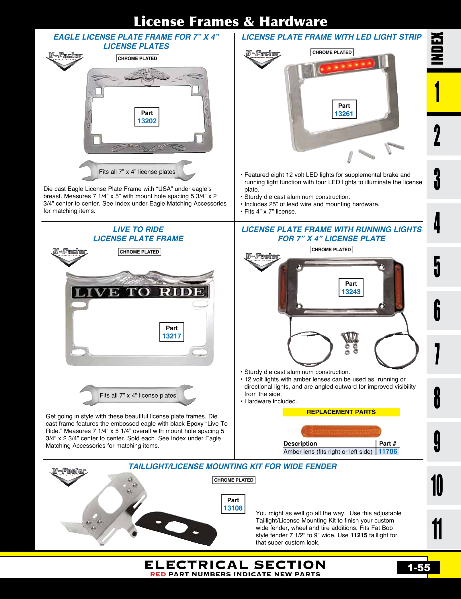 | MU-13243 | LICENSE PLATE FRAME,W/12 VOLT AMBER RUNNING LIGHTS FIT 4"X7" LICENSE PLATES CHROMED ALUM | EACH | $ 45.60 |
