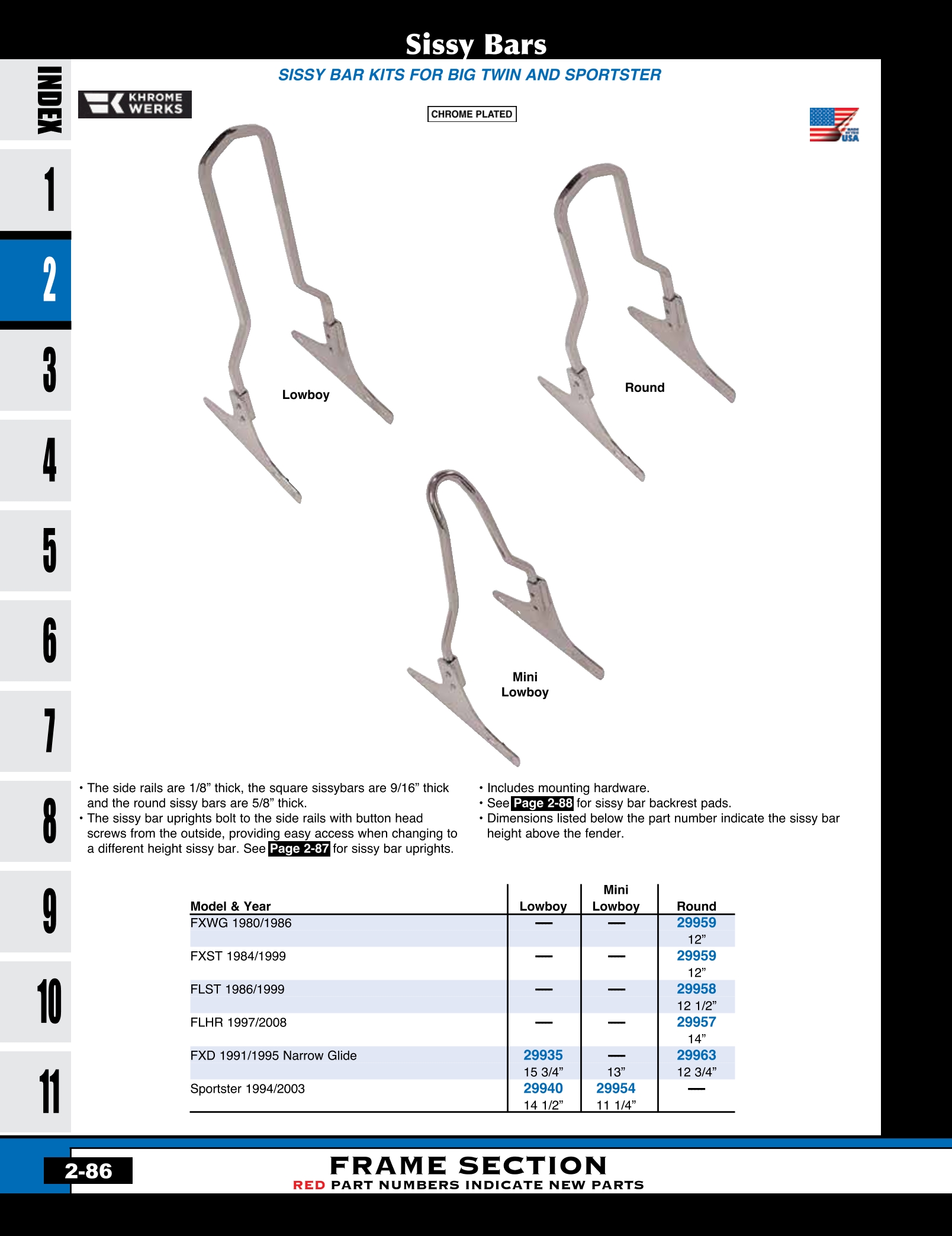 | MU-28229 | SISSY BAR,ROUND 13"TALL FXR 82/L DYNA 91/01(EX FXDWG) 6-11/16" WIDE CHROME | EACH | 99.03 |